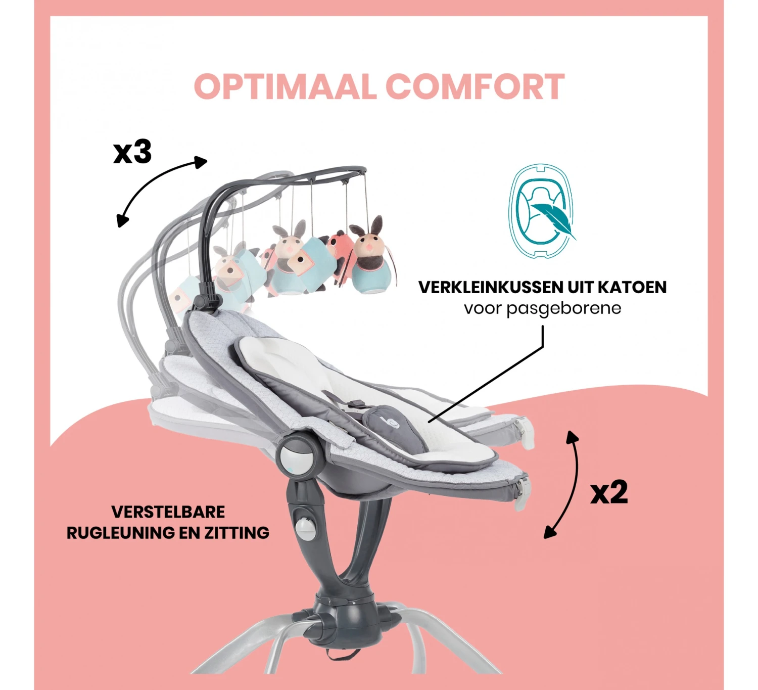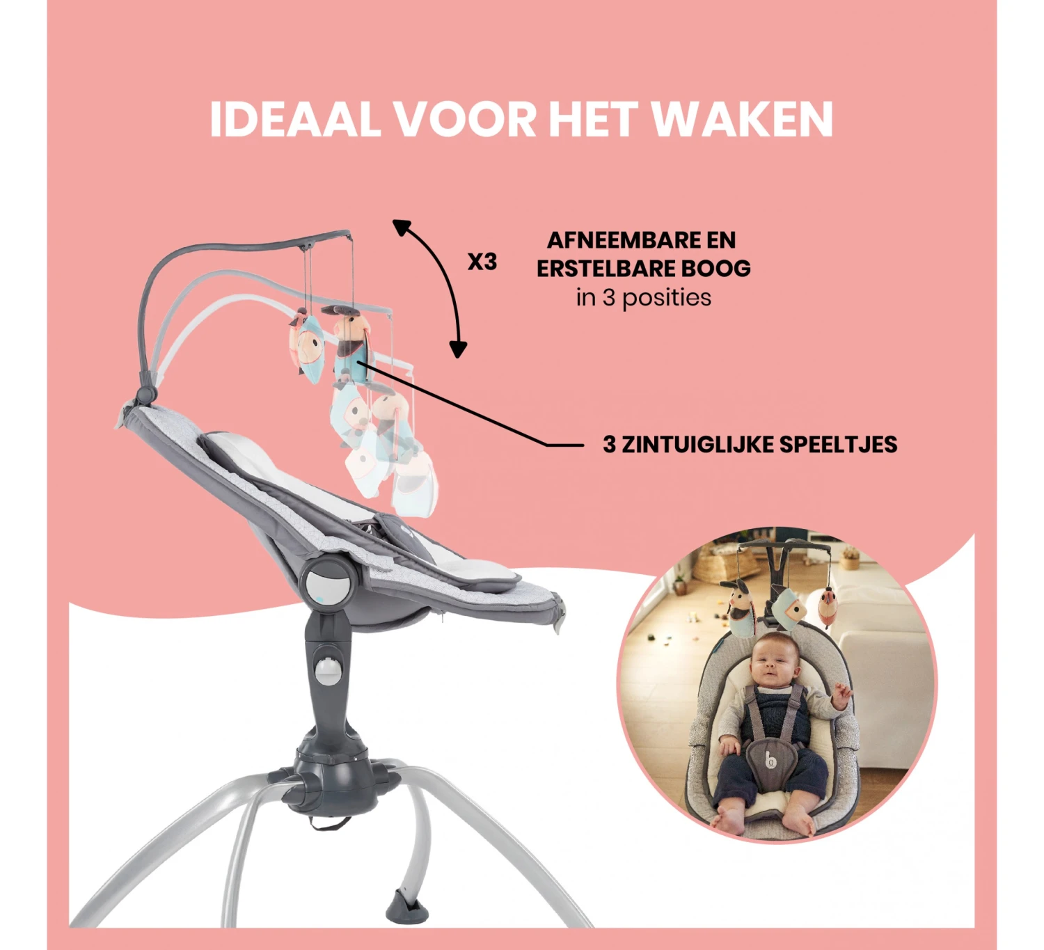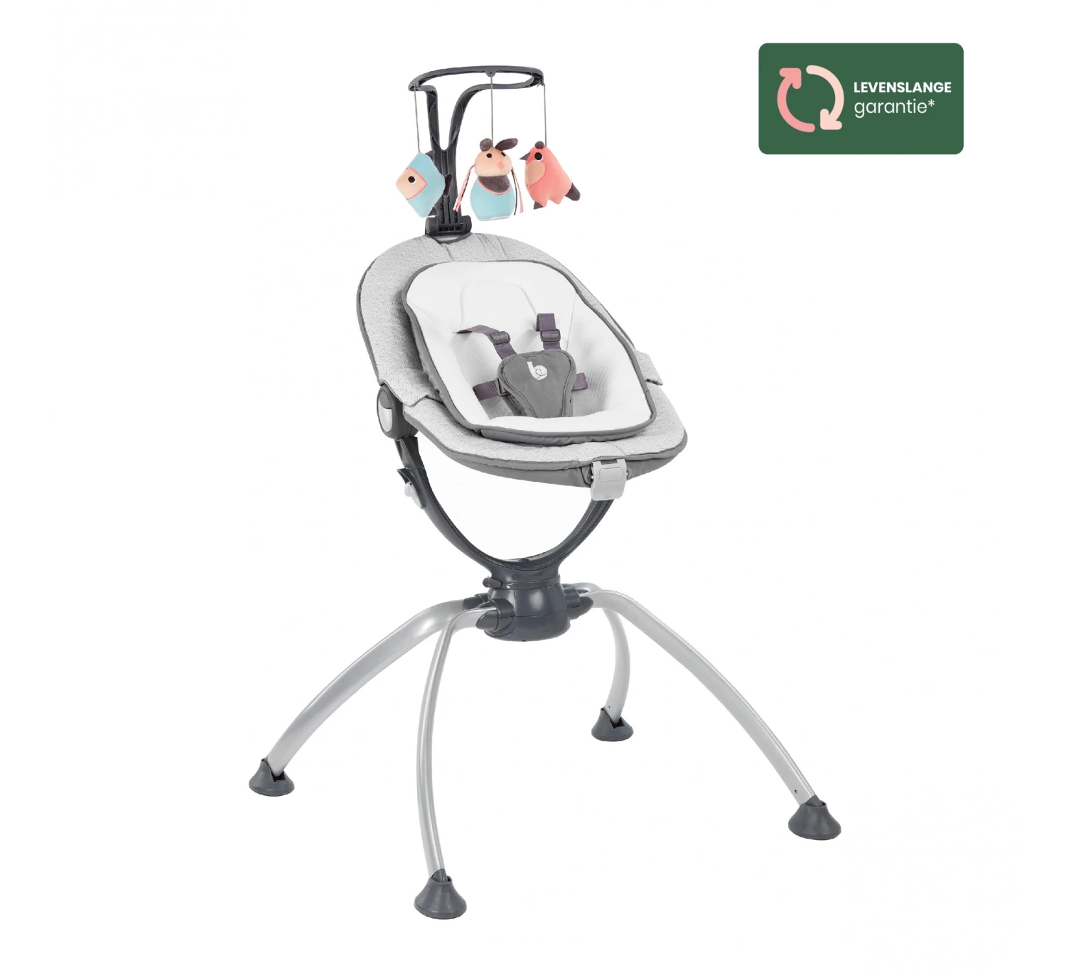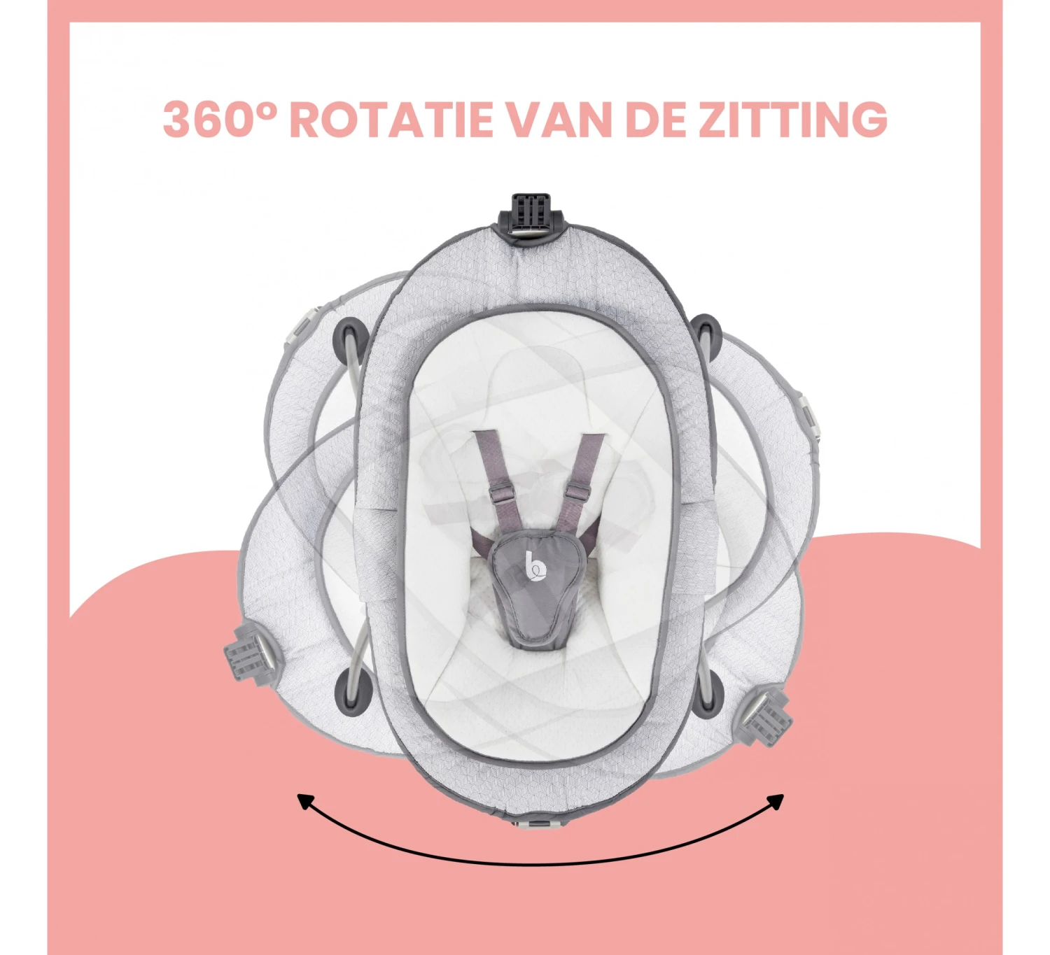 De Swoon Up Graphik is de ideale hoogteligstoel om unieke familiemomenten mee te maken. De ligstoel kan eenvoudig worden ingeklapt en zo gemakkelijk worden opgeborgen. Dit maakt dat de Swoon Up Graphik zeer praktisch is en makkelijk vervoerd kan worden. De Swoon Up heeft een 360° draaiende zitting waarmee je je baby in het middelpunt van het gezinsleven plaatst, zonder dat je de ligstoel hoeft te verslepen. De stoel is eenvoudig in te stellen op twee hoogtes (55-75cm) en de rugleuning en zitting hebben meerdere schuine standen (2 voor de zitting en 3 voor de rugleuning). Zo kun je de stoel altijd lekker comfortabel instellen. Het extra zachte verkleinkussen van de ligstoel is perfect geschikt voor pasgeborenen en dankzij de vijfpuntsveiligheidsgordel bovendien ook veilig. De Swoon Up wordt geleverd met een speelboog en drie speeltjes. De speelboog is in te stellen in drie standen en is ook afneembaar.