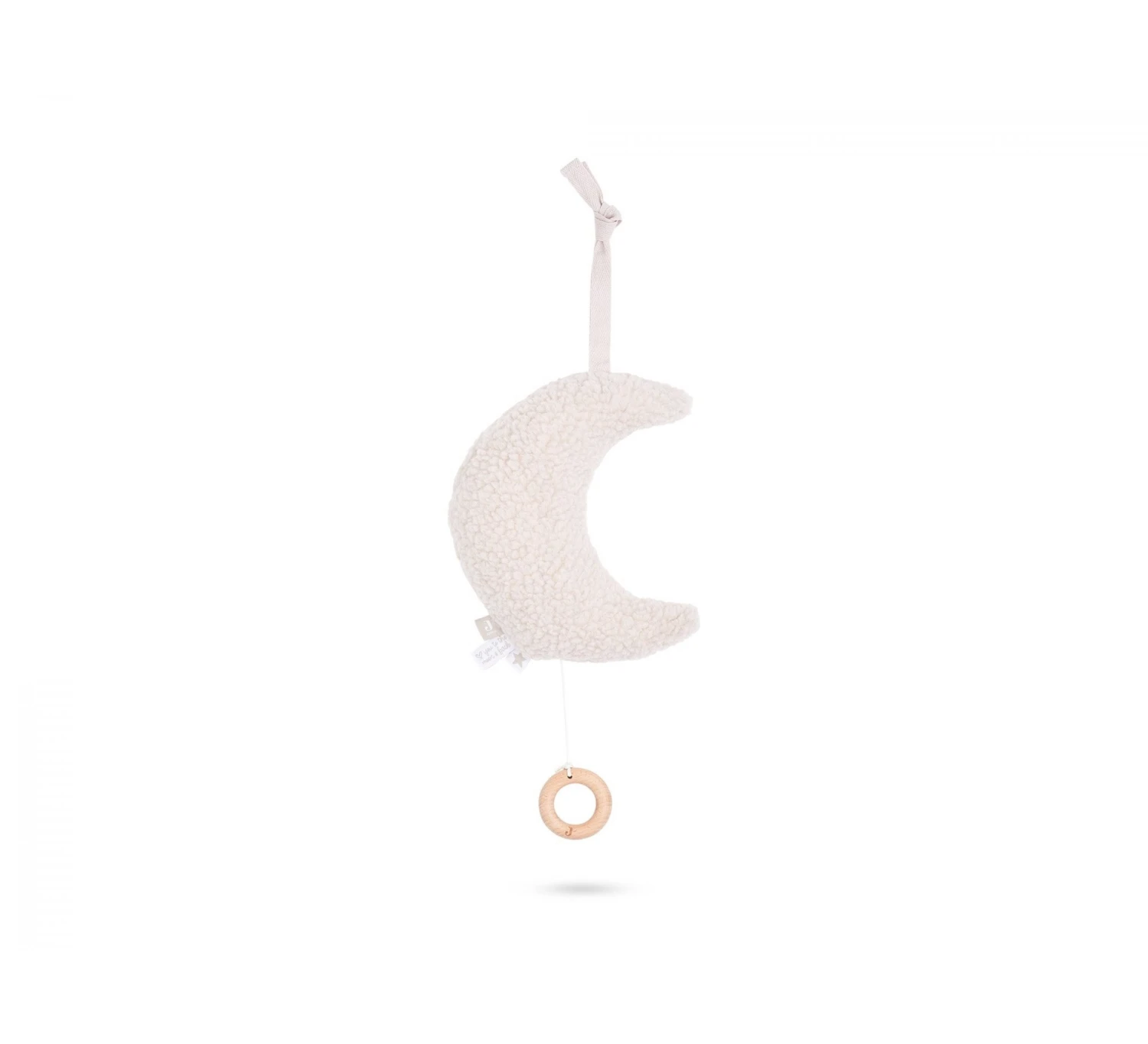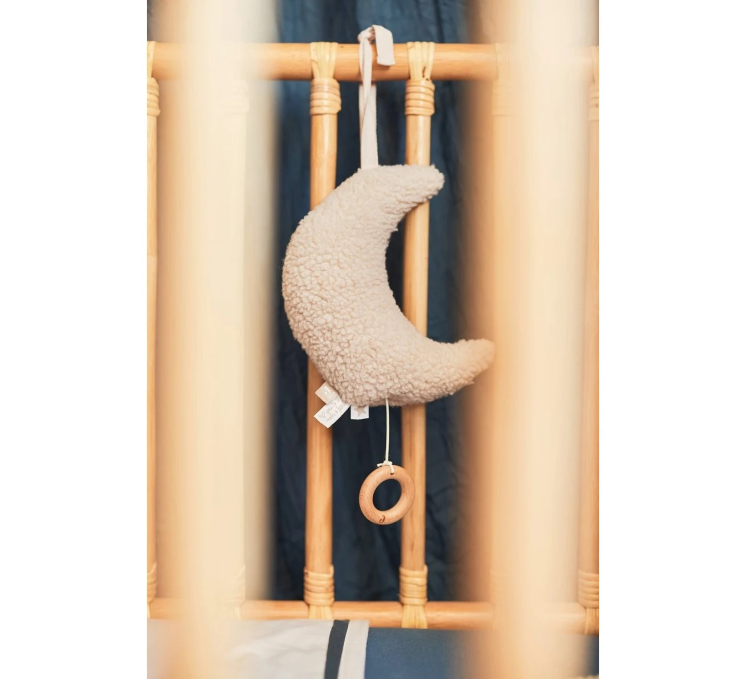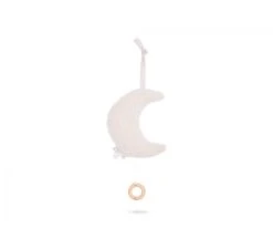Met deze muziekhanger van Jollein kan je kindje heerlijk genieten van een rustgevend melodietje. De muziekhanger heeft de vorm van een maan en heeft een houten ringetje aan het trekkoordje. Met de handige touwtjes hang je de hanger op elke gewenste plek op. De hanger is gemaakt van zachte pluchestof aan de buitenkant en is gevuld met polyestervezels.