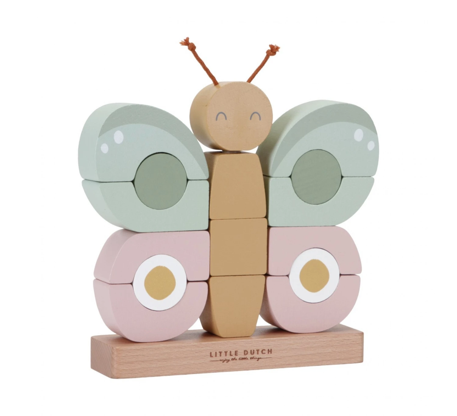 De vlinderstapelaar ondersteunt de oog-handcoördinatie van je kindje en staat leuk als decoratie in de kinderkamer.